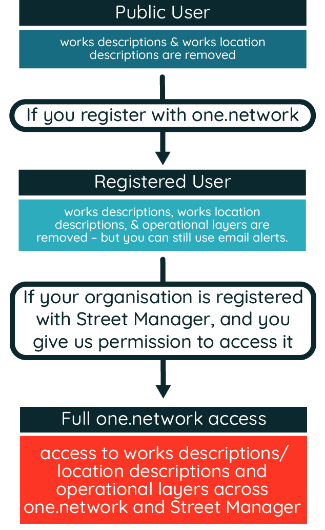 If you work for an organisation that has Street Manager access, when you provide us with your login details we’re able to show you even more information. You’ll be able to use all the standard operational layers across one.network, plus any paid layers you’ve subscribed to as a one.network customer, and you’ll have works descriptions and location descriptions back.