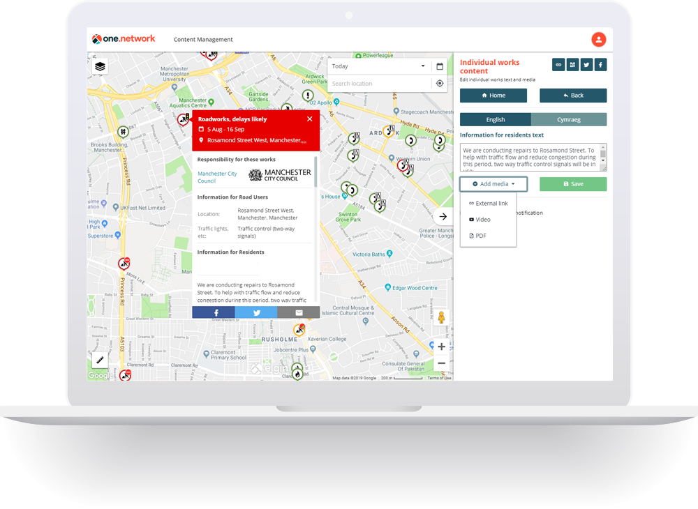 one.network is the only shared road management platform that connects highway authorities and utilities with the public. Every day, over 20,000 operational users leverage the platform to plan, coordinate and communicate road events, ensuring drivers and the general public receive the best information as efficiently as possible.