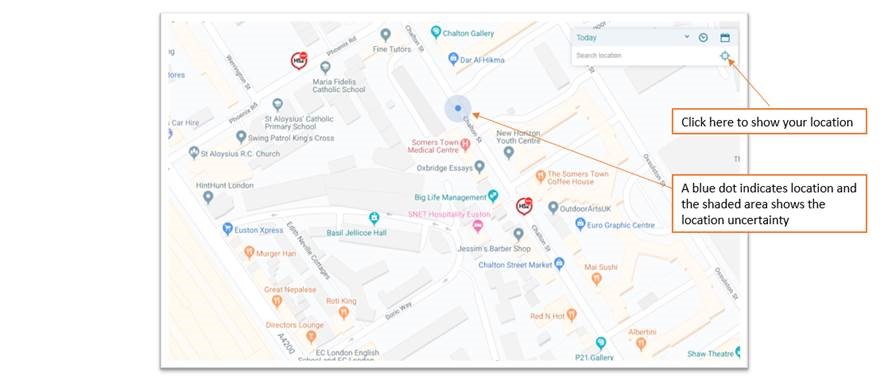 When the user clicks on the “Show my location” feature, their location is now indicated by a blue dot which will be familiar to users of Google Maps and similar services. This feature works on both mobile and desktop devices so long as the device and browser are configured to share your location.